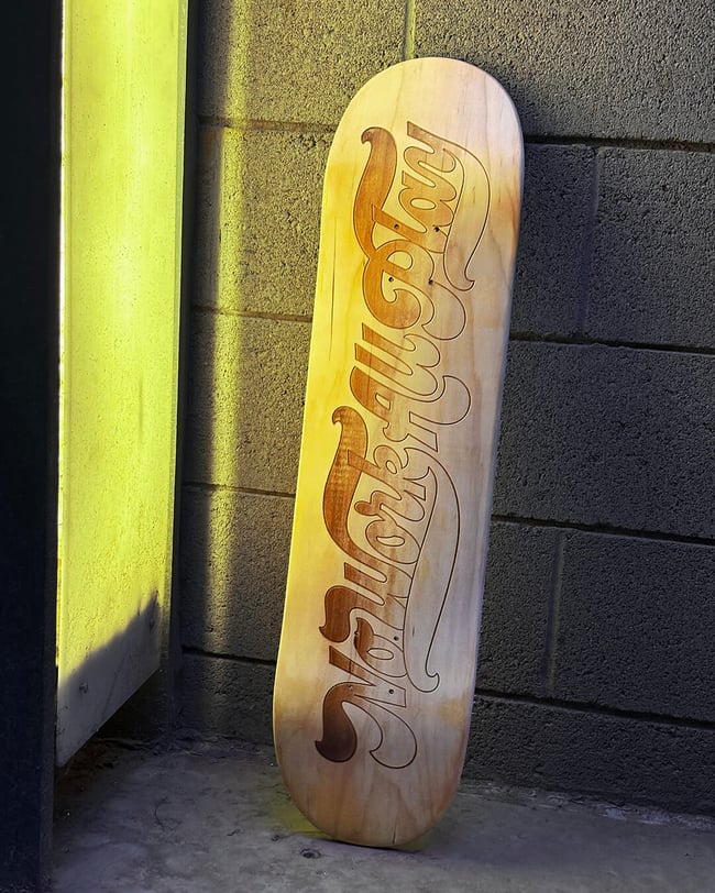 Custom “No Work, All Play” lettering, hand-drawn specifically for this deck and permanently laser-etched into the surface. Only 4 boards produced, making this an extremely limited run.